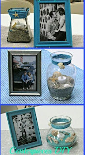 We knew fresh flowers would be spendy. Plus, we wanted to have something that family members could take home as mementos of the happy occasion. We bought some items from Dollar Tree as well. See the frame above (and in photos below)? Those were from Dollar Tree and I just sat down one evening and painted over the wood-look finish. I did leave some "as is" since the frame matched the photo so well.