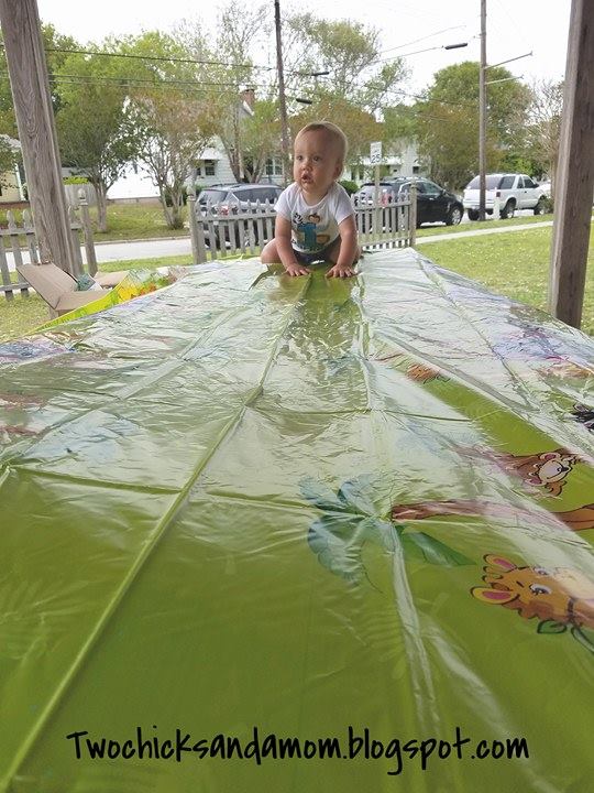 Above, you will see Parker showing off one of the tablecloths. Below you can see both. They have fun little animals on them and with the mess that was made with his cake - saved us from ruining the picnic tables at the park, haha.